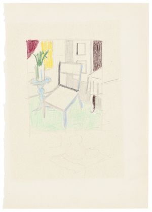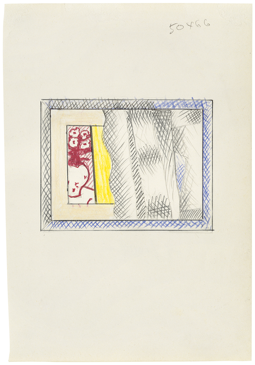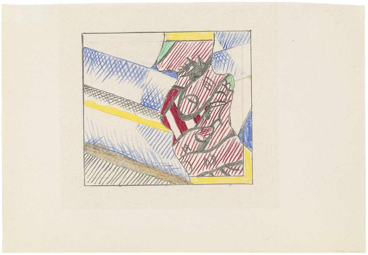 In addition to tracing from projections, Lichtenstein traced directly from source material or from his own drawings and collages onto tracing paper and Denril. Tracings that have drawing on both sides (as indicated in the media line) were used to transfer an image to another sheet or board.