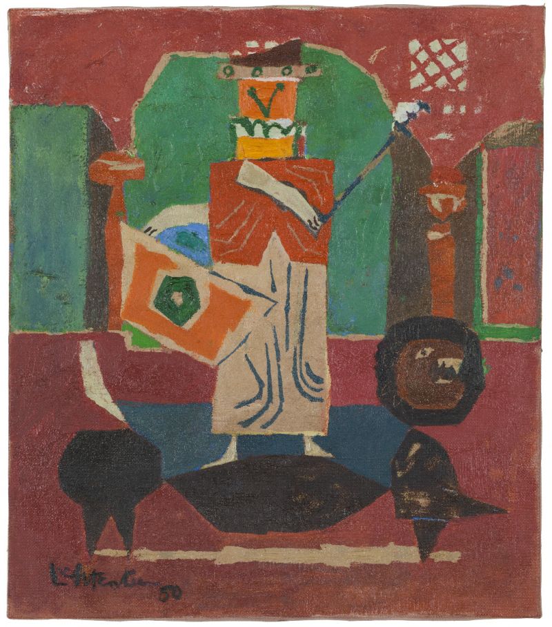 Signed and dated lower left: Lichtenstein / 50; inscribed, signed and dated stretcher, upper left: MAN ON A LION / R.F. LICHTENSTEIN / 1950
