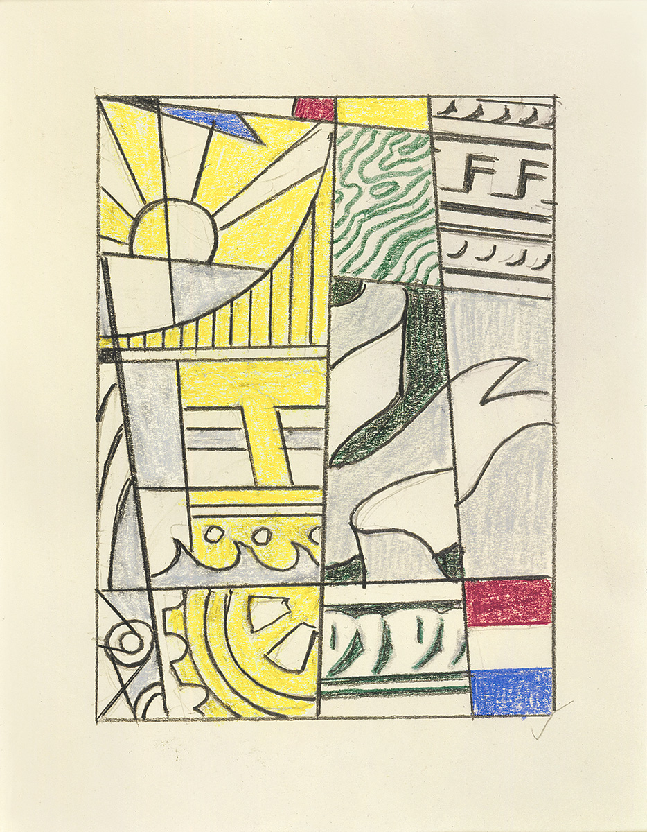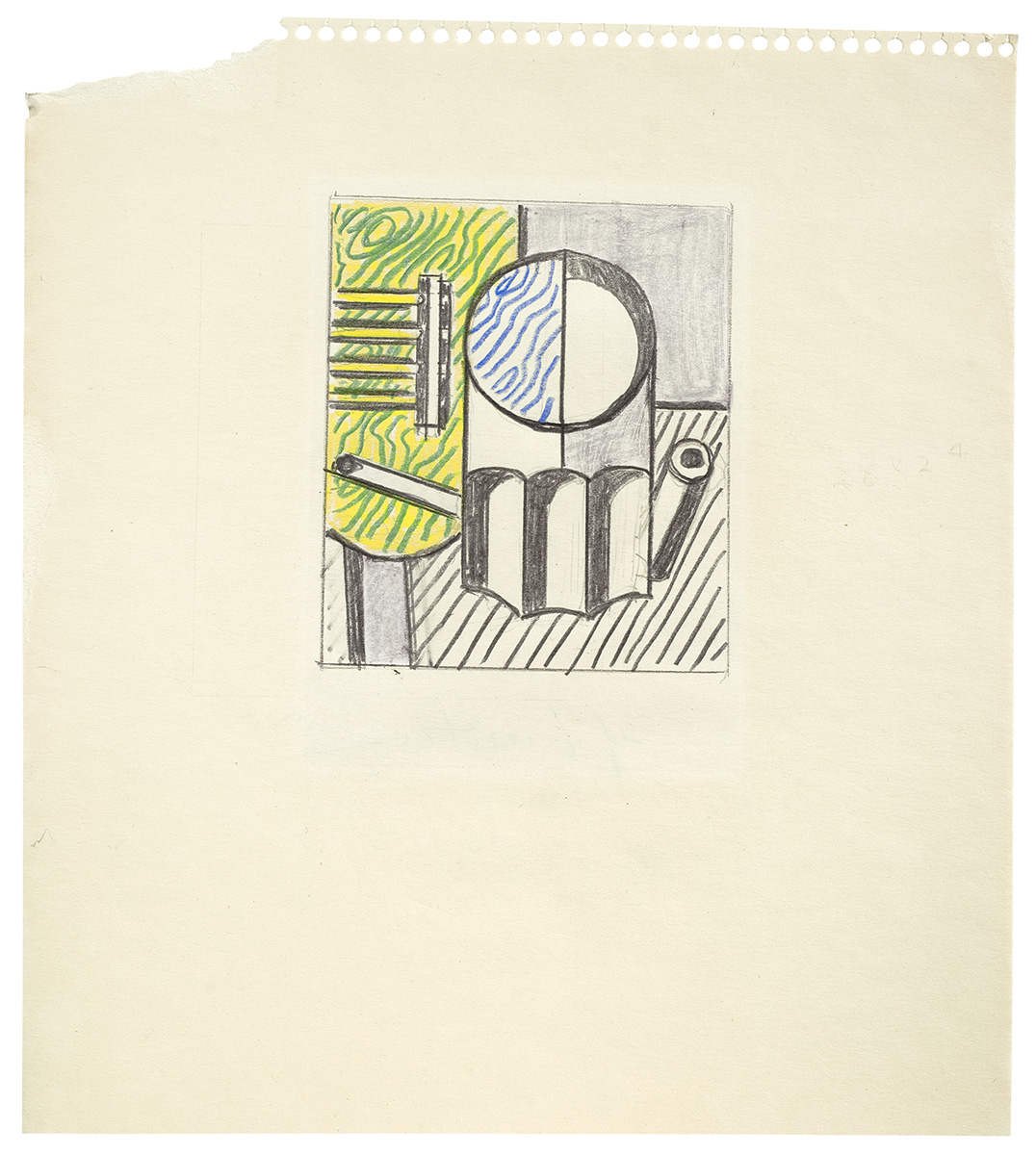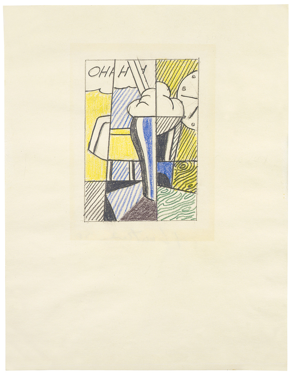 In addition to tracing from projections, Lichtenstein traced directly from source material or from his own drawings and collages onto tracing paper and Denril. Tracings that have drawing on both sides (as indicated in the media line) were used to transfer an image to another sheet or board.