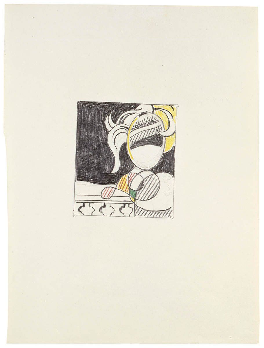 In addition to tracing from projections, Lichtenstein traced directly from source material or from his own drawings and collages onto tracing paper and Denril. Tracings that have drawing on both sides (as indicated in the media line) were used to transfer an image to another sheet or board.