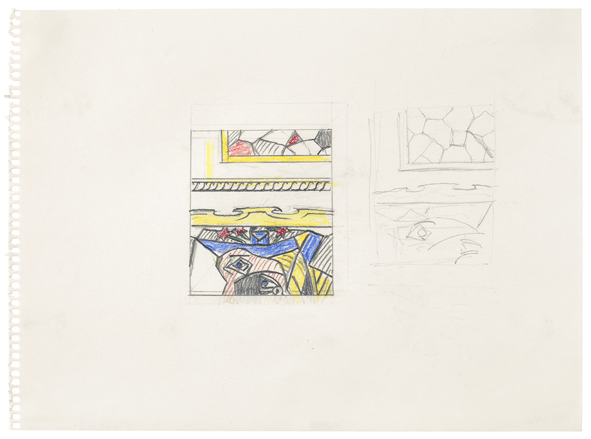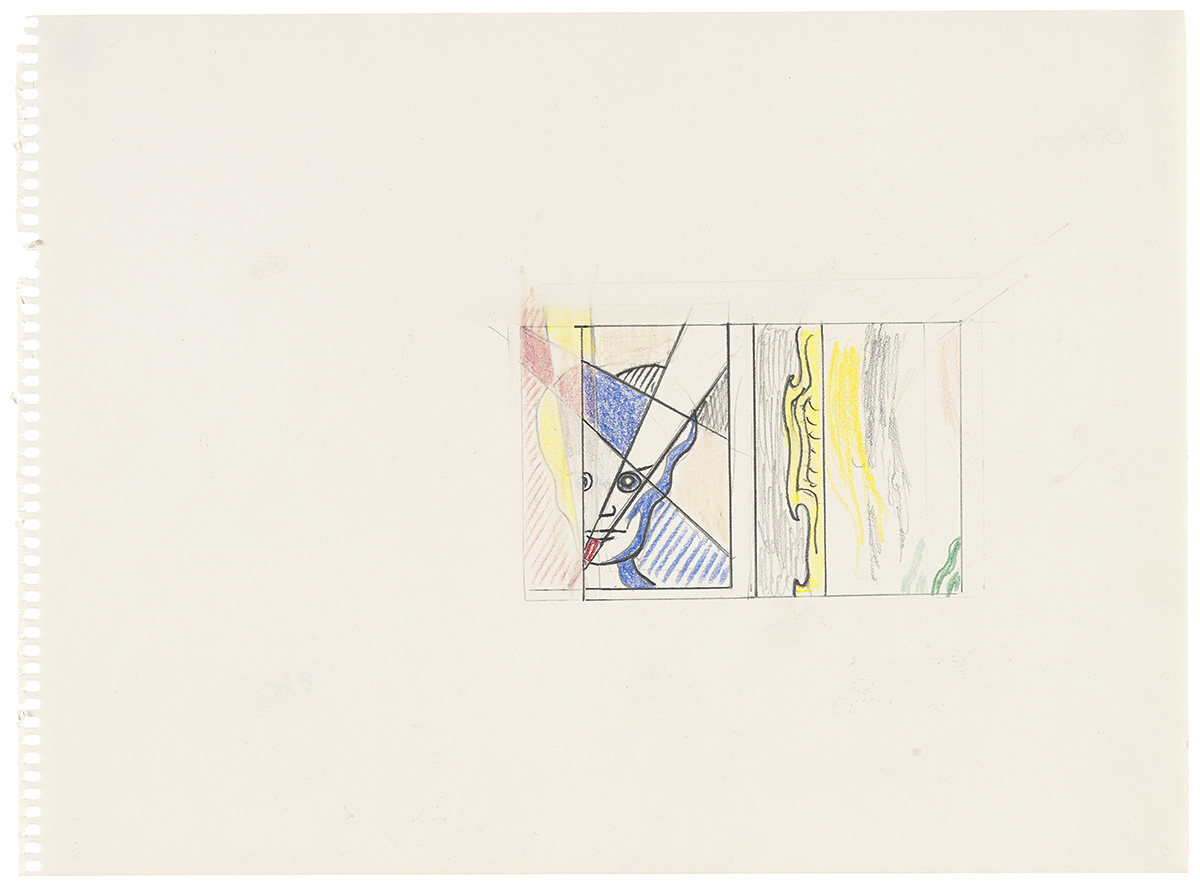 In addition to tracing from projections, Lichtenstein traced directly from source material or from his own drawings and collages onto tracing paper and Denril. Tracings that have drawing on both sides (as indicated in the media line) were used to transfer an image to another sheet or board.