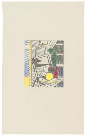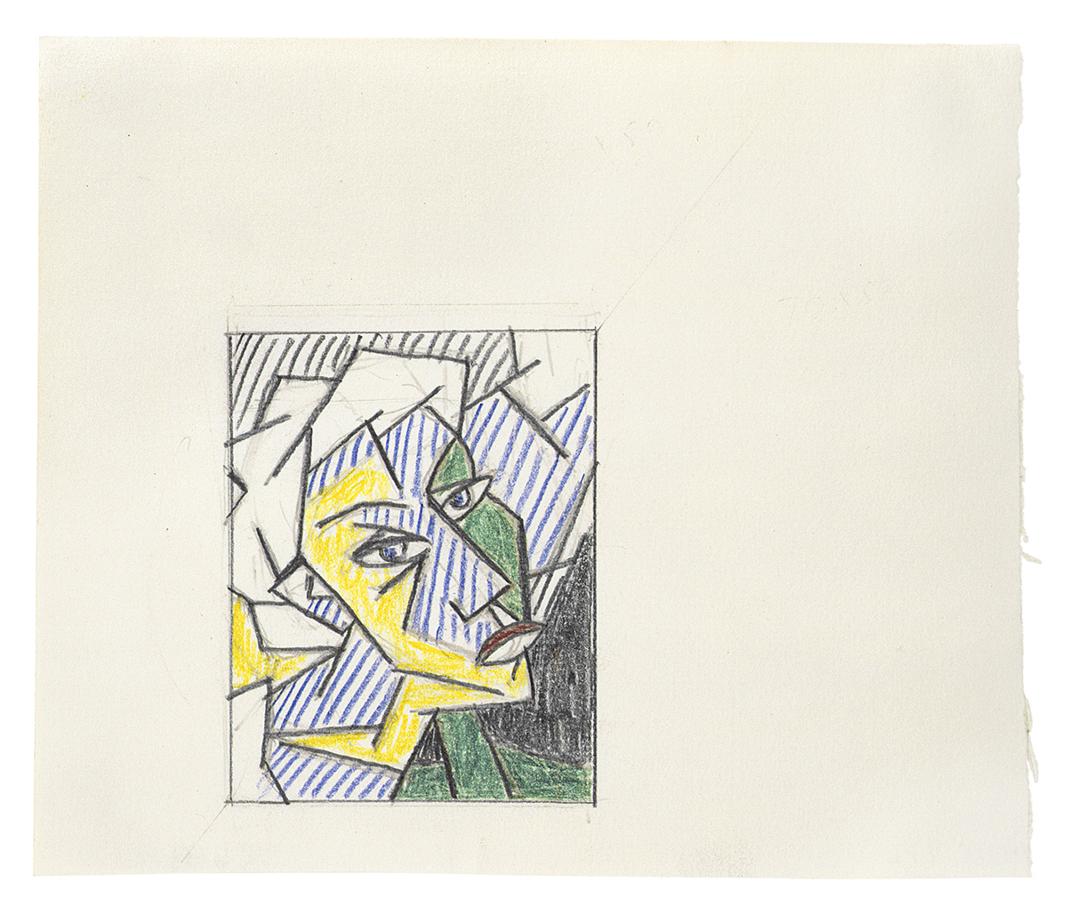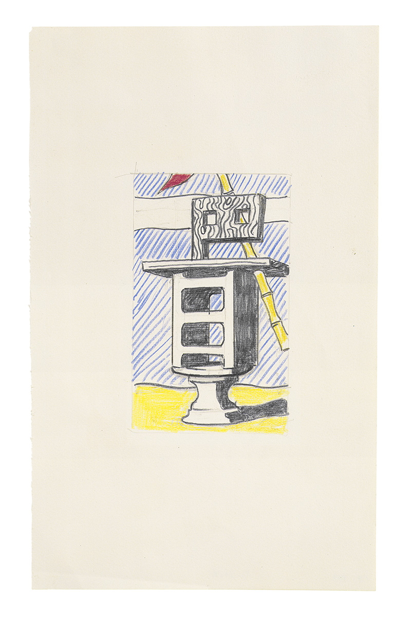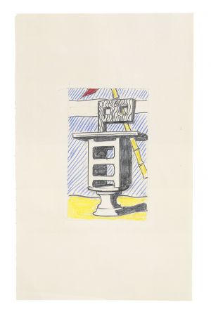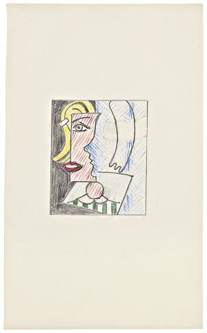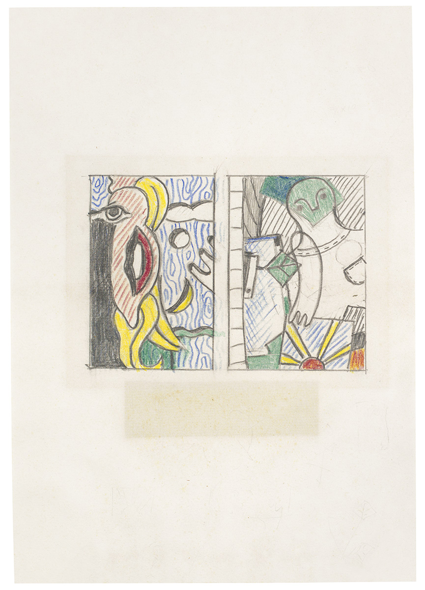 In addition to tracing from projections, Lichtenstein traced directly from source material or from his own drawings and collages onto tracing paper and Denril. Tracings that have drawing on both sides (as indicated in the media line) were used to transfer an image to another sheet or board.