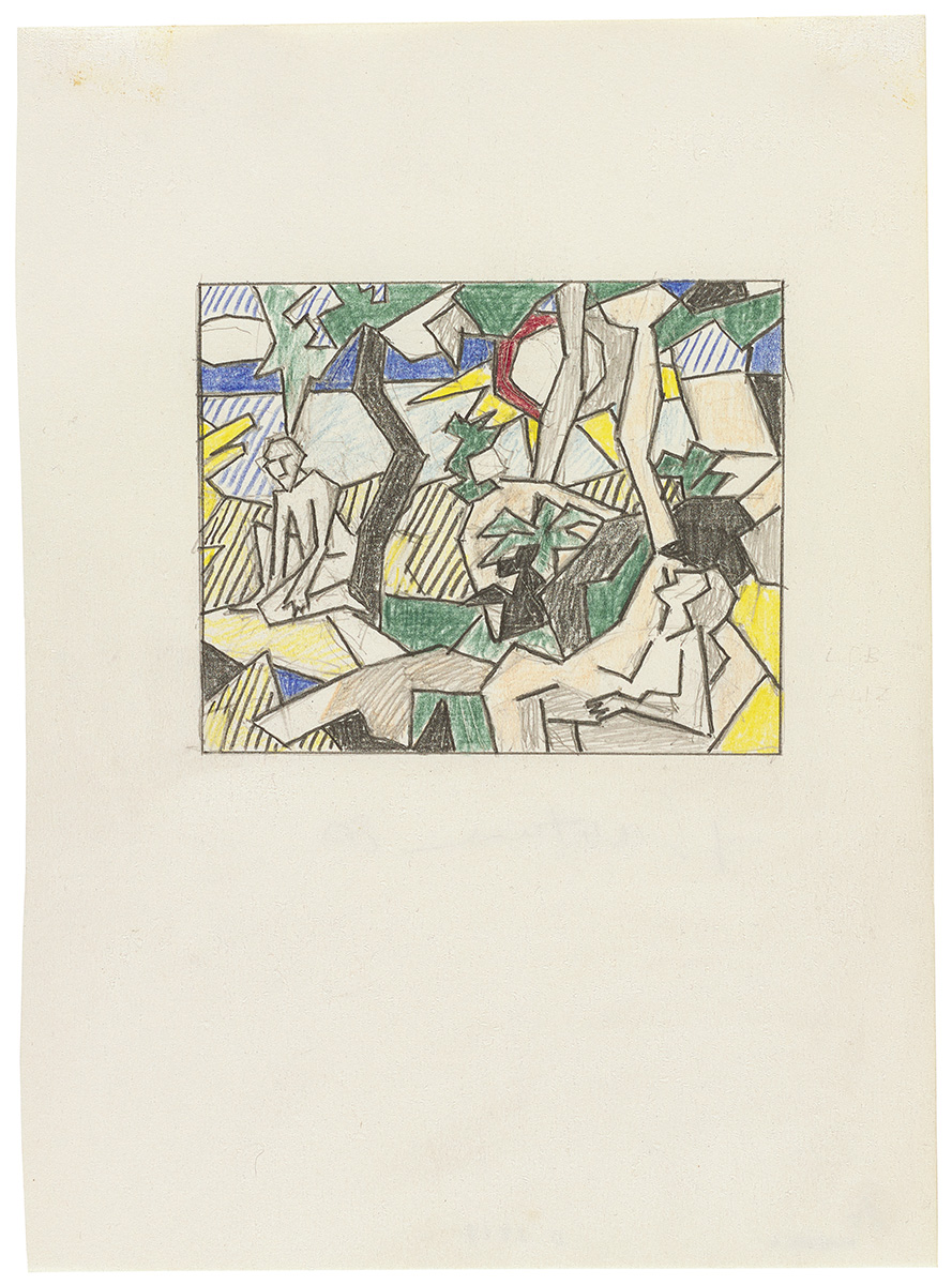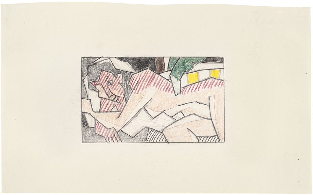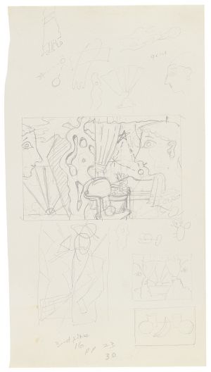 The artist usually signed and/or dated his drawings once they left his studio. At times, this was years after completion and the date of creation was misremembered. Those dates have been corrected with a remark explaining the rationale. In the absence of an artist date, dates usually follow the RL Studio Card, or the date of a related subsequent work (e.g., a more finished collage, or final painting) with the qualifier "c."