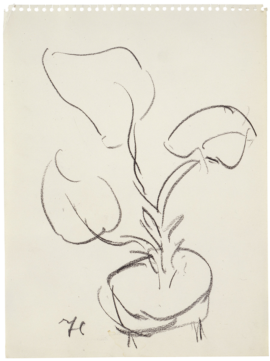 Bolder graphite lines and fill have often been confused with black colored pencil, which the artist rarely used. Thicker graphite lines sometimes suggest the use of graphite stick. Due to a lack of definite confirmation, in this catalogue, all graphite lines are categorized as graphite pencil.