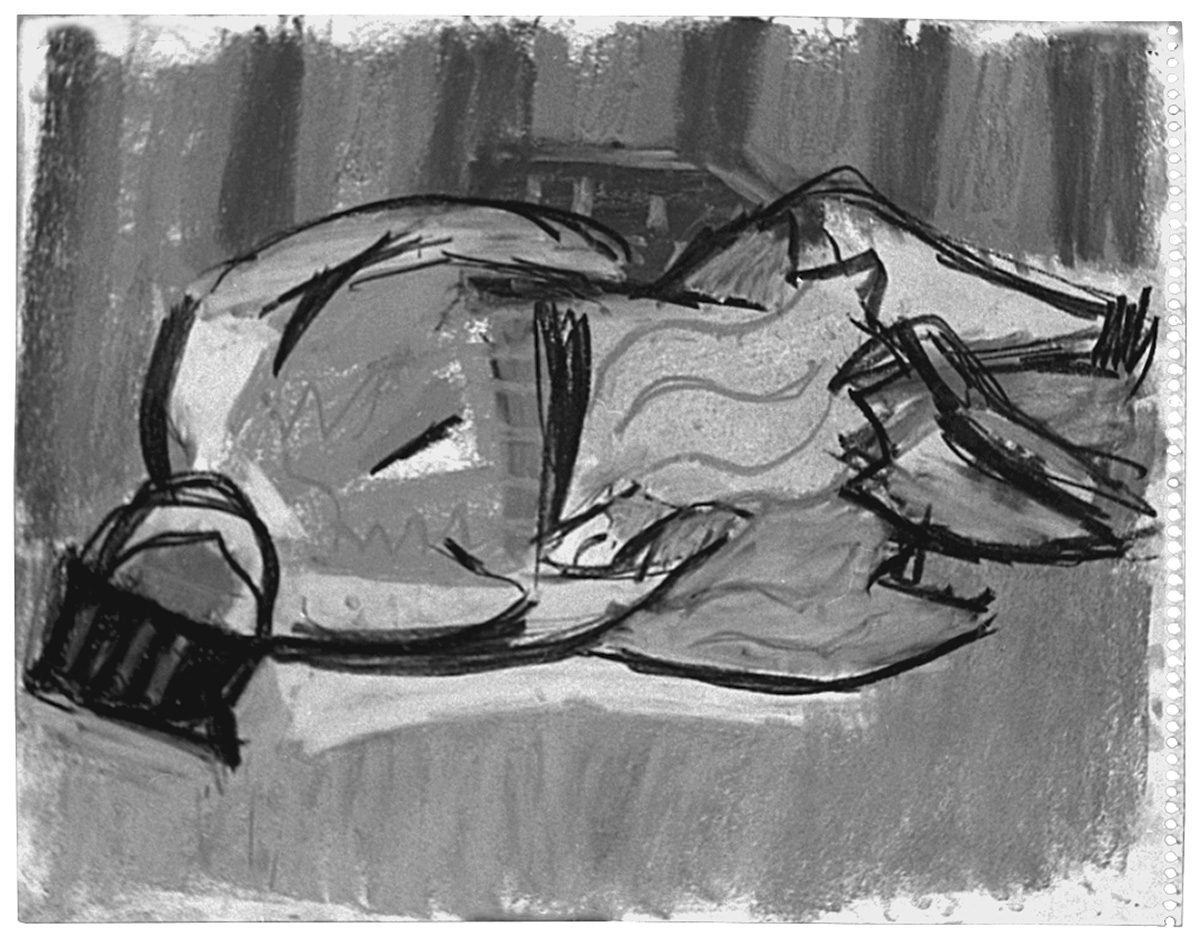 Lichtenstein used pastel and charcoal primarily in his early drawings. Charcoal wash refers to fields of charcoal pigment that were spread with a wetted brush.