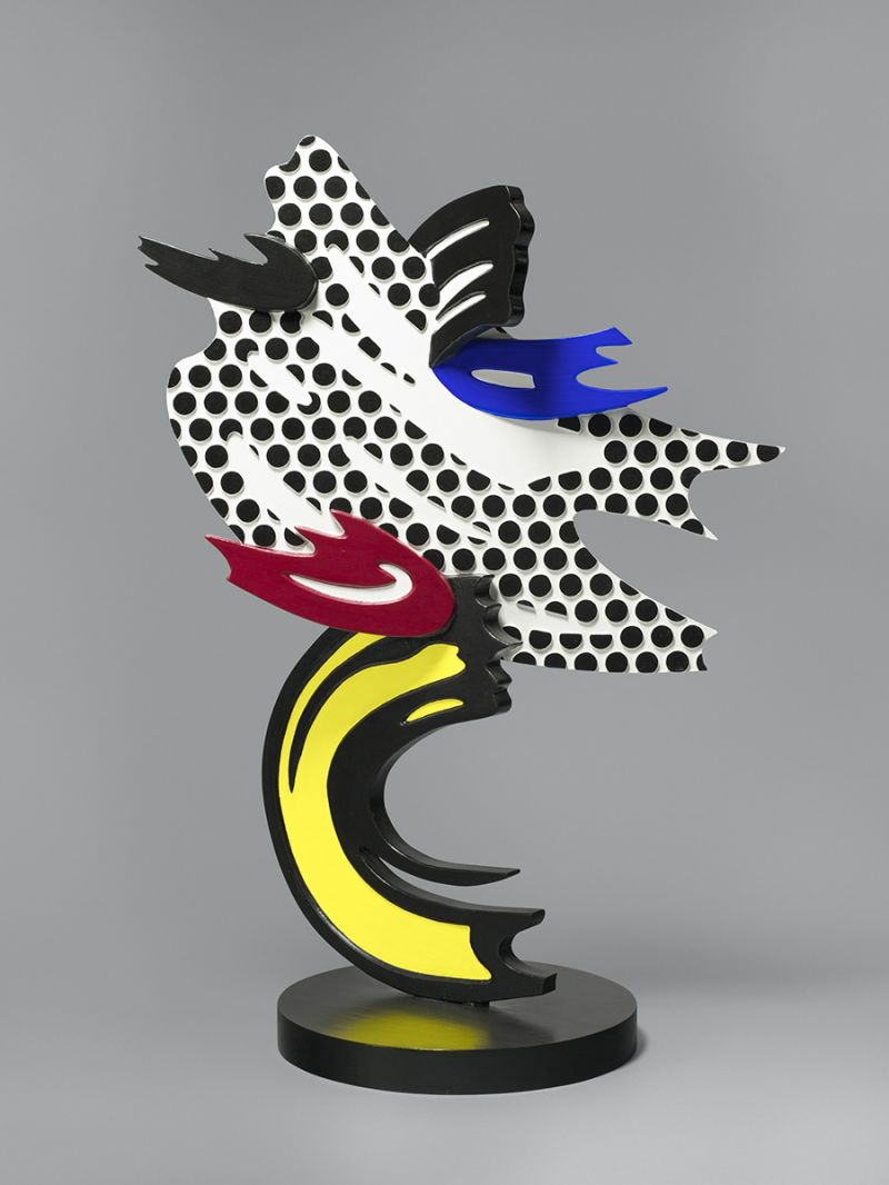 Most of Lichtenstein’s unique sculptures are models, prototypes and maquettes leading to editioned sculptures. Starting in the mid-1970s, Lichtenstein would prepare a design (collage or foamcore maquette) for a sculpture edition, which would be made into a wooden maquette by the builder Carlos Ramos. The maquette was sometimes modified further and eventually approved by the artist, painted by the artist’s assistant James dePasquale and sent to the fabricator of the edition.