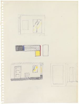 Mediums indicate the materials employed by Lichtenstein throughout a sketchbook, usually graphite pencil and colored pencil. Detailed information is provided in the individual sketchbook page entries. Support refers to the paper comprising the text block, defined as all the leaves in the sketchbook, except for the endpapers. Further paper characterization (color, thickness, etc.) is provided in the Description. If parts of pages have been removed, "cutout" or "tear-out" is listed after the support. Any loose material found in a sketchbook is listed last.
