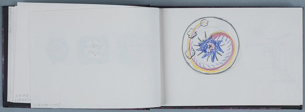Mediums indicate the materials employed by Lichtenstein throughout a sketchbook, usually graphite pencil and colored pencil. Detailed information is provided in the individual sketchbook page entries. Support refers to the paper comprising the text block, defined as all the leaves in the sketchbook, except for the endpapers. Further paper characterization (color, thickness, etc.) is provided in the Description. If parts of pages have been removed, "cutout" or "tear-out" is listed after the support. Any loose material found in a sketchbook is listed last.