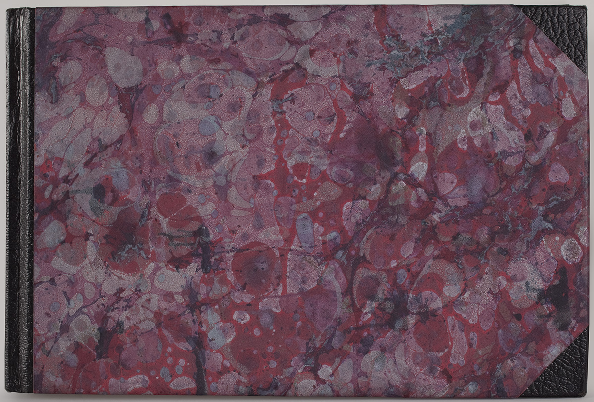 Quarter case binding with black imitation-leather cloth along spine and corners and colored marbled paper over boards, thread sewing and black and white cloth stuck-on endbands. Inside back cover, "URC," in relief (blind stamped from verso): "DIANE MAURER 1989." Machine-made, wove, smooth, white paper with cut edges. No watermarks. Page thickness 0.007 in. No endpaper. Incisions, score lines and stubs due to page removal; one leaf nearly detached from text block. Eraser crumbs throughout.