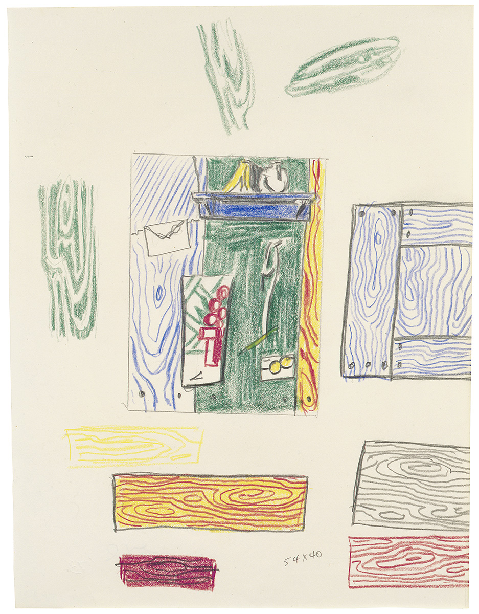 Mediums indicate the materials employed by Lichtenstein throughout a sketchbook, usually graphite pencil and colored pencil. Detailed information is provided in the individual sketchbook page entries. Support refers to the paper comprising the text block, defined as all the leaves in the sketchbook, except for the endpapers. Further paper characterization (color, thickness, etc.) is provided in the Description. If parts of pages have been removed, "cutout" or "tear-out" is listed after the support. Any loose material found in a sketchbook is listed last.