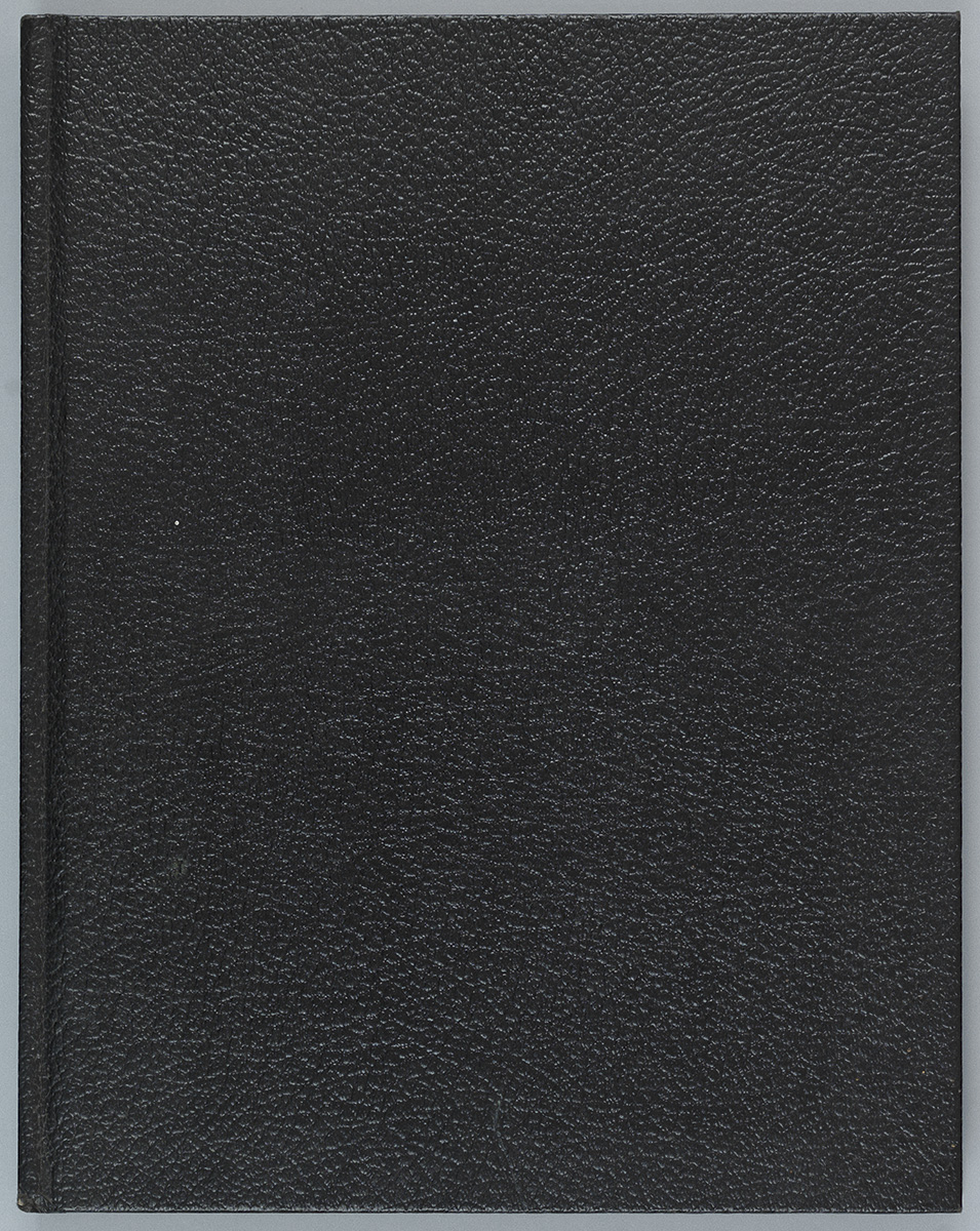 Full case binding with black imitation leather paper covering; thread sewing; no endbands. Machine-made, wove, smooth, white paper with cut edges. No watermarks. Page thickness 0.005 in. No endpaper. Incisions, score lines and stubs due to page removal. Linear depressions from pressure of drawing on nearby page. Eraser crumbs throughout.