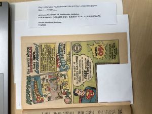 Lichtenstein created and gathered various types of reference material, including cartoon and magazine clippings—stored loose or pasted into notebooks—and photographs he took of works in progress in his studio and of New York City architecture. Most of this material is still held by the Roy Lichtenstein Foundation Archives and has been gifted to the Archives of American Art Smithsonian Institution, Washington, D.C. It is currently being digitized.